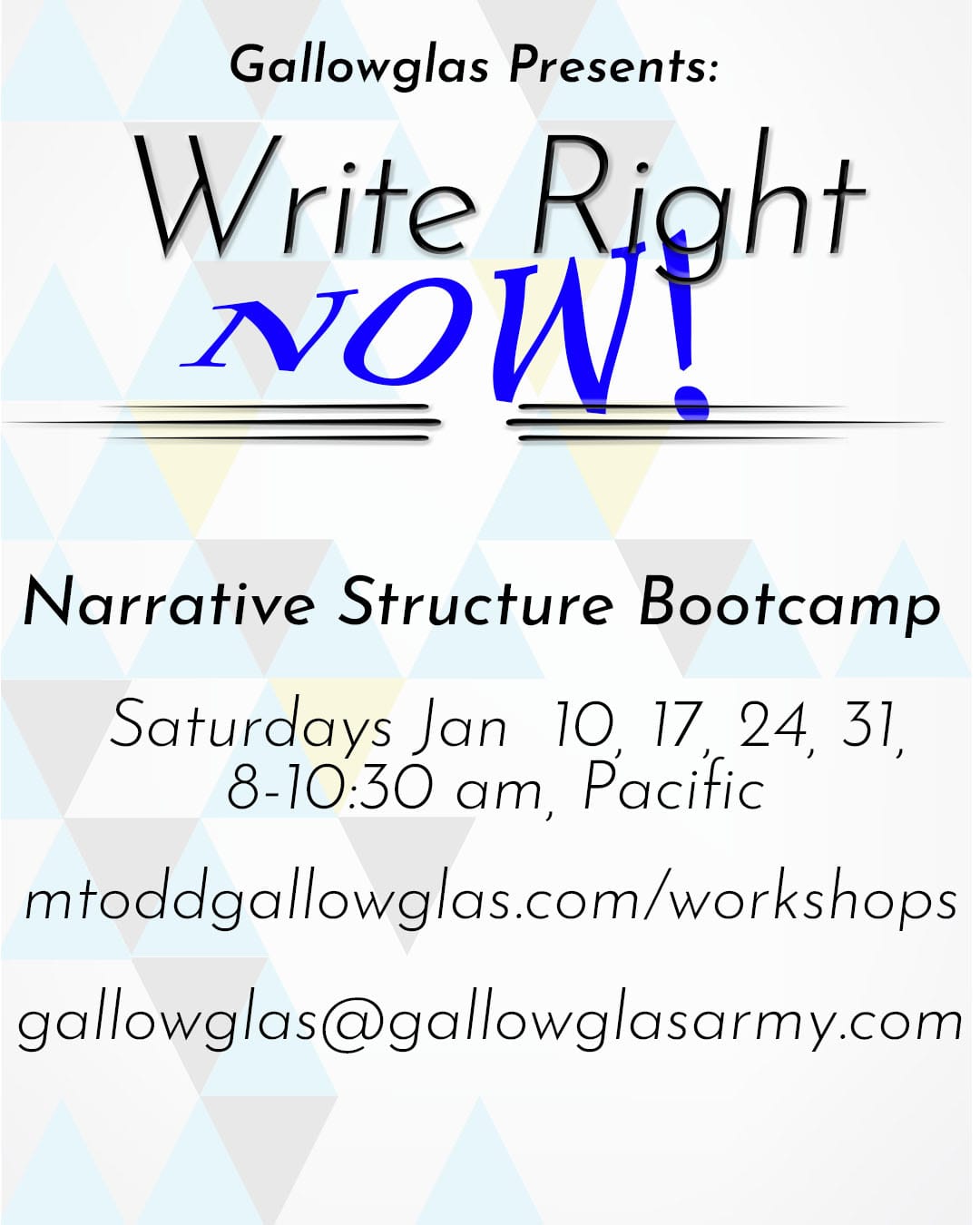 I do have a new Zoom class starting this Saturday morning and running through the rest of the month. Narrative Structure Boot Camp will offer you new ways to explore your stories. Week one, we'll go through the Gallowglas Story Path. In week two, I'll take you through the Gallowglas Narrative Algorithm. In week three, I'll introduce the Axioms. And in week four, we'll work on wrapping them together to create more engaging stories. However, these tools won't just help you craft stronger stories; they will help you examine other stories so you can tell why they are or aren't working.